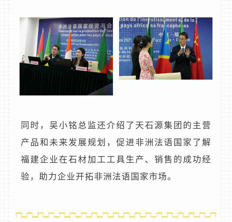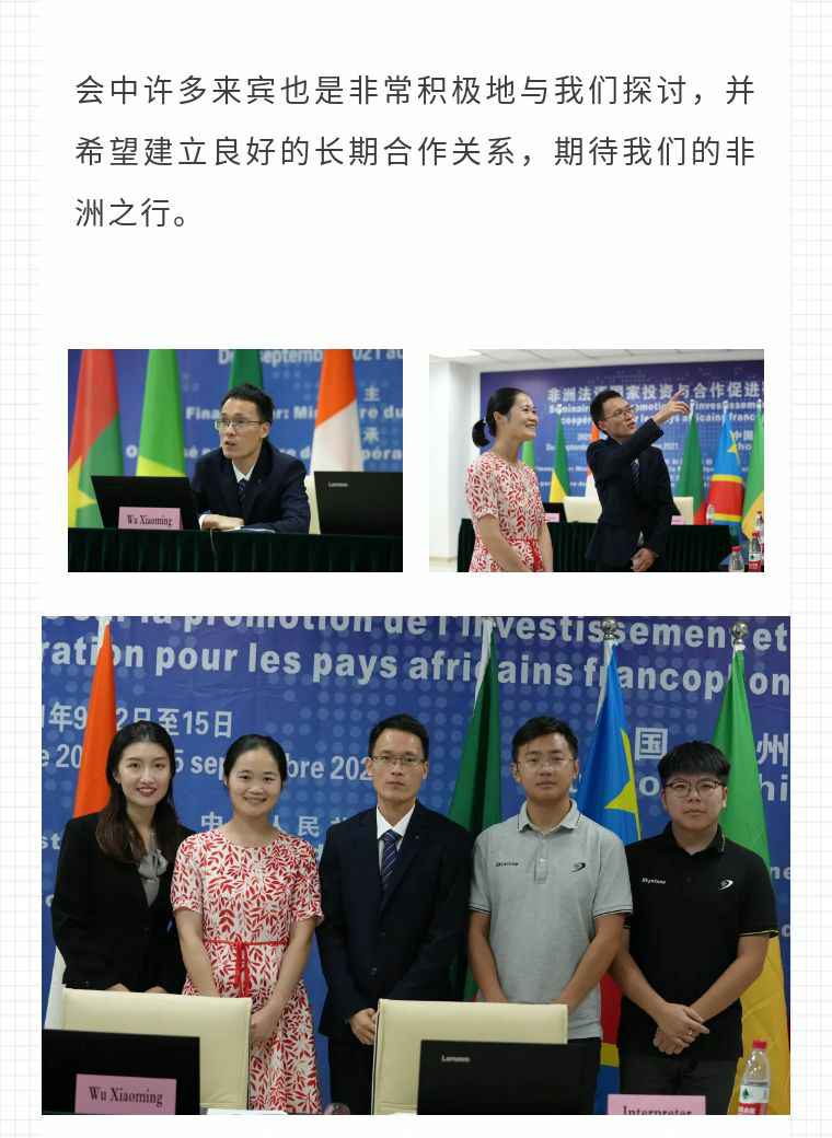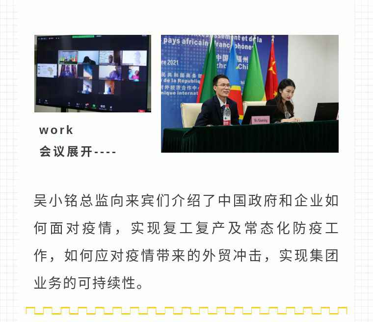 2021年9月6日,开云体育-开云(中国)一站式服务官方网站应福建省对外经济合作中心邀请,由非洲大区市场总监吴小铭作为代表与包括25位来自非洲法语国家经贸、投资促进政府部门官员及企业管理人员就疫情下中国企业如何应对机遇与挑战展开讨论。